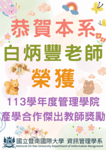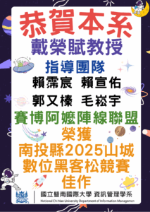 國立暨南國際大學資訊管理學系 > 訊息公告-全部 訊息公告 全部 招生 課程/演講/活動 競賽 榮譽事蹟 在學生 本系老師 畢業系友 獎學金 徵才 / 實習 媒體報導 全部 114學年度資管系寒假轉學考 2025 年 12 月 12 日 Read More » 【資訊管理學系115級專題總審】🌟 2025 年 12 月 8 日 Read More » 【轉知】2026年ITSA生成式AI應用網頁設計競賽 2025 年 12 月 5 日 Read More » 【資管系1141學期專題演講】主題:Gen AI Discovery Testbed for Embedding, Vector Store, RAG, Fine-tuning, Memory, and On-demand Search 2025 年 12 月 2 日 Read More » 恭賀!!本系陳小芬老師指導團隊榮獲「南投縣2025山城數位黑客松競賽」大專組銀牌 2025 年 11 月 24 日 Read More » 恭賀!!本系姜美玲老師指導團隊榮獲「南投縣2025山城數位黑客松競賽」大專組佳作 2025 年 11 月 24 日 Read More » 恭賀!!本系戴榮賦老師指導團隊榮獲「南投縣2025山城數位黑客松競賽」大專組佳作 2025 年 11 月 24 日 Read More » 【資管系1141學期專題演講】主題:Learning Dynamics for Convergences in Multiagent Systems 2025 年 11 月 20 日 Read More » 中國信託資訊科技企業實習計畫 2025 年 11 月 18 日 Read More » 115學年度資管系碩士班甄試考生口試注意事項&考生口試順序時間表 2025 年 11 月 18 日 Read More » 「2026—22nd科技教育研究與發展學術研討會」論文徵稿 2025 年 11 月 18 日 Read More » 中部科學園區創新技術論壇 2025 年 11 月 18 日 Read More » 2026臺灣電腦輔助語言學習學會暨全球電腦輔助語言學習國際研討會 2025 年 11 月 18 日 Read More » 恭賀本系白炳豐老師榮獲113學年度管理學院產學合作傑出教師獎勵 2025 年 11 月 17 日 Read More » 115學年度資管系碩士班甄試考生口試注意事項 2025 年 11 月 10 日 Read More » « 上一頁 頁面1 頁面2 頁面3 頁面4 頁面5 下一頁 »