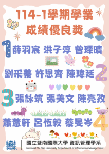 國立暨南國際大學資訊管理學系 > 訊息公告-榮譽事蹟-在學生 訊息公告 全部 招生 課程/演講/活動 競賽 榮譽事蹟 在學生 本系老師 畢業系友 獎學金 徵才 / 實習 媒體報導 在學生 恭賀114-1學期學業成績優良學生 2026 年 3 月 27 日 Read More » 恭賀!本系男籃榮獲第25屆管院盃亞軍 2026 年 2 月 9 日 Read More » 114.12.10 (三)資管系115級專題總審成果發表與競賽得獎名單✨ 2025 年 12 月 29 日 Read More » 恭賀!本系學生榮獲【114學年度第一學期教育部研究所優秀獎學金】 2025 年 12 月 22 日 Read More » 恭賀!!本系陳小芬老師指導團隊榮獲「南投縣2025山城數位黑客松競賽」大專組銀牌 2025 年 11 月 24 日 Read More » 恭賀!!本系姜美玲老師指導團隊榮獲「南投縣2025山城數位黑客松競賽」大專組佳作 2025 年 11 月 24 日 Read More » 恭賀!!本系戴榮賦老師指導團隊榮獲「南投縣2025山城數位黑客松競賽」大專組佳作 2025 年 11 月 24 日 Read More » 恭賀!!本系簡宏宇老師指導學生「2025 全國資服競賽」 資訊應用組二第一名 2025 年 11 月 4 日 Read More » 恭賀!!本系鄭育評老師指導學生「2025第30屆大專校院資訊應用服務創新競賽」榮獲教育AI組佳作 2025 年 11 月 4 日 Read More » 恭賀!本系男女混排榮獲114學年度新生盃季軍 2025 年 10 月 27 日 Read More » 恭賀113-2學期學業成績優良學生 2025 年 10 月 14 日 Read More » 恭喜本系簡齊君、賴霈宸同學受國立教育廣播電臺邀請參與【幸福南臺灣】節目訪問 2025 年 10 月 11 日 Read More » 【恭賀】本系吳楷賀同學當選2025年Google學生開發者社群領袖-暨大(Google Developer Groups on Campus NCNU)! 2025 年 8 月 21 日 Read More » 恭賀!!本系鄭育評助理教授指導本系碩士生蕭逸參加ICITL 2025國際研討會榮獲最佳論文獎 2025 年 8 月 21 日 Read More » 恭賀!!本系陳品蓉同學榮獲教育部114年數位學伴計畫「傑出帶班老師」 2025 年 8 月 11 日 Read More » « 上一頁 頁面1 頁面2 頁面3 頁面4 頁面5 下一頁 »