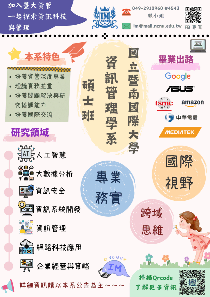國立暨南國際大學資訊管理學系 > 資管系簡介 資訊管理學系【學士班】與【碩士班】招生簡介和DM 學士班(點選右下Adobe之LOGO即可放大參閱) 碩士班(點選右下Adobe之LOGO即可放大參閱) 學士班DM 碩士班DM 歡迎大家加入國立暨南國際大學資訊管理學系⁽⁽٩(๑˃̶͈̀ ᗨ ˂̶͈́)۶⁾⁾