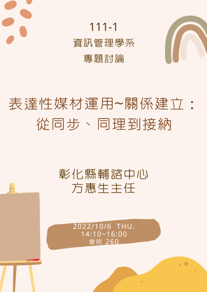 資訊管理學系將於 2022.10.06 辦理專題演講,相關資訊如下:講者:彰化縣輔諮中心方惠生主任演講主題: 表達性媒材運用~關係建立:從同步、同理到接納時間:2022/10/06(四)下午2:10~4:00 相關文章 【資訊管理學系115級專題總審】🌟2025 年 12 月 8 日 【資管系1141學期專題演講】主題:Gen AI Discovery Testbed for Embedding, Vector Store, RAG, Fine-tuning, Memory, and On-demand Search2025 年 12 月 2 日 【資管系1141學期專題演講】主題:Learning Dynamics for Convergences in Multiagent Systems2025 年 11 月 20 日