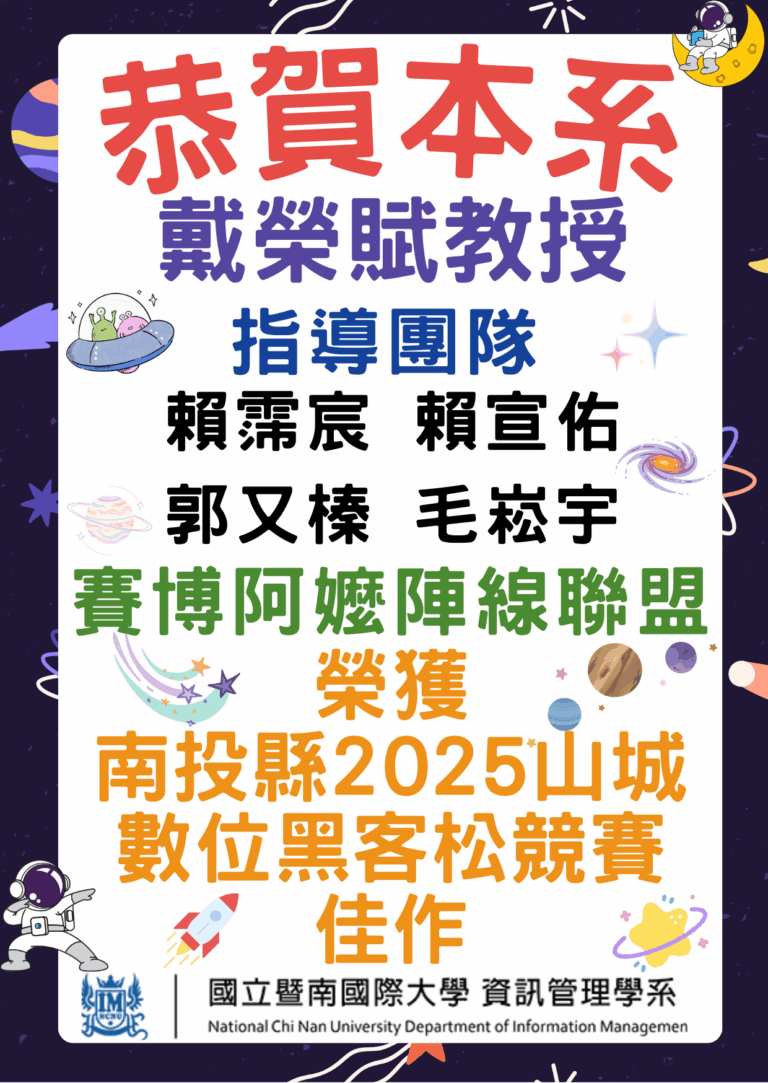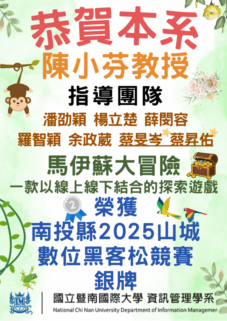 感謝資管系碩二蘇美婷同學於2023/3/6(一) 晚間8:30~9:30帶來線上精彩留學經驗分享,期望對同學未來規畫能有助益! 相關文章 恭賀!!本系陳小芬老師指導團隊榮獲「南投縣2025山城數位黑客松競賽」大專組銀牌2025 年 11 月 24 日 恭賀!!本系姜美玲老師指導團隊榮獲「南投縣2025山城數位黑客松競賽」大專組佳作2025 年 11 月 24 日 恭賀!!本系戴榮賦老師指導團隊榮獲「南投縣2025山城數位黑客松競賽」大專組佳作2025 年 11 月 24 日