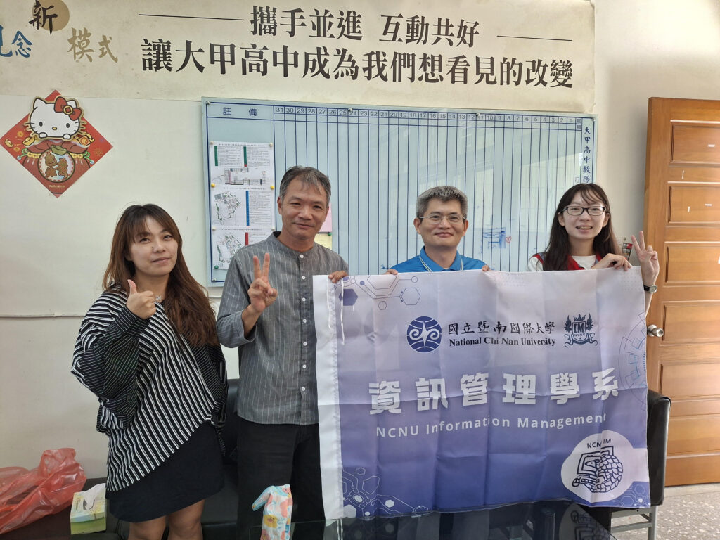 本系洪嘉良教授(右二)、教學組長江佩珊老師(左一)、教務主任高志璟老師(左二)、及數學教師羅珮綺老師(右一)等人,一起討論數理教學的精進策略,以利銜接高中端、大學端的數學能力。盼能啟發同學在數學方面的學習動機,為未來儲備更大的發展潛力,以滿足 AI 時代的數學需求。