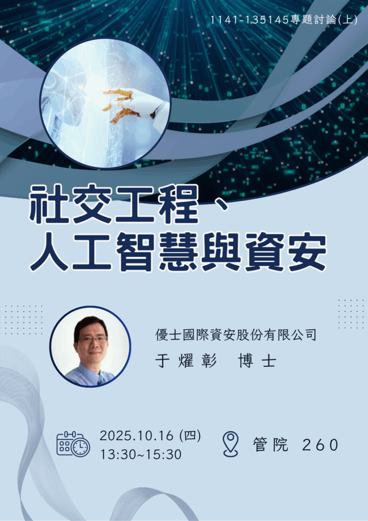 資訊管理學系將於2025.10.16辦理專題演講,相關資訊如下:講者:優士國際資安股份有限公司 于燿彰 博士日期:114/10/16 (四)時間:13:30地點:管260 相關文章 【資管系1141學期專題演講】主題:Gen AI Discovery Testbed for Embedding, Vector Store, RAG, Fine-tuning, Memory, and On-demand Search2025 年 12 月 2 日 【資管系1141學期專題演講】主題:Learning Dynamics for Convergences in Multiagent Systems2025 年 11 月 20 日 「2026—22nd科技教育研究與發展學術研討會」論文徵稿2025 年 11 月 18 日
