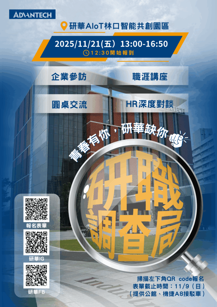 研華科技誠摯邀請同學參加 《研職調查局》企業參訪活動,親臨研華AIoT林口智能共創園區,一探物聯網與智慧科技的實際應用!