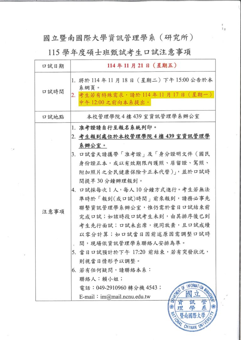 有關本系115學年度資訊管理學系碩士班甄試考生口試注意事項如下,敬請考生留意: 口試日期:114年11月21日(星期五) 口試時間:將於114年11月18日(星期二)下午15:00公告於本系網頁。 考生若有特殊需求,請於114年11月17日(星期一)中午12:00之前向本系提出,逾時不候。 口試地點:本校管理學院4樓439室資訊管理學系辦公室。 若有任何疑問,請聯絡本系: 聯絡人:賴小姐 電話:049-2910960 轉4543 E-mail:im@mail.ncnu.edu.tw 下面連結為本校公告之115學年度碩士班甄試通過審查名單&碩士班甄試審查逕行錄取名單,敬請參閱。https://admission.ncnu.edu.tw/p/406-1055-30794,r567.php?Lang=zh-tw 附件:115學年度碩士班甄試考生口試注意事項__公告版__1141110 相關文章 115學年度資管系碩士班甄試考生口試注意事項&考生口試順序時間表2025 年 11 月 18 日 【轉知】管理學院全英碩士學位學程,115 學年度入學甄試熱情招生2025 年 10 月 21 日 🙌115學年度碩士班甄試入學已開始報名囉!🙌2025 年 10 月 20 日