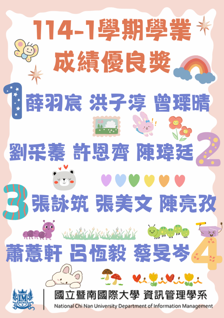 恭賀本系:薛羽宸、洪子淳、曾瑮晴、劉采蓁、許恩齊、陳瑋廷、張詠筑、張美文、陳亮孜、蕭薏軒、呂恆毅、蔡旻岑,榮獲114-1學期書卷獎! 相關文章 恭賀本系王育民教授榮獲彰化高中學術成就類第十二屆傑出校友!!2026 年 3 月 16 日 恭賀!本系男籃榮獲第25屆管院盃亞軍2026 年 2 月 9 日 恭賀本系學生榮獲114-2學期在學外國學生獎勵2026 年 1 月 26 日