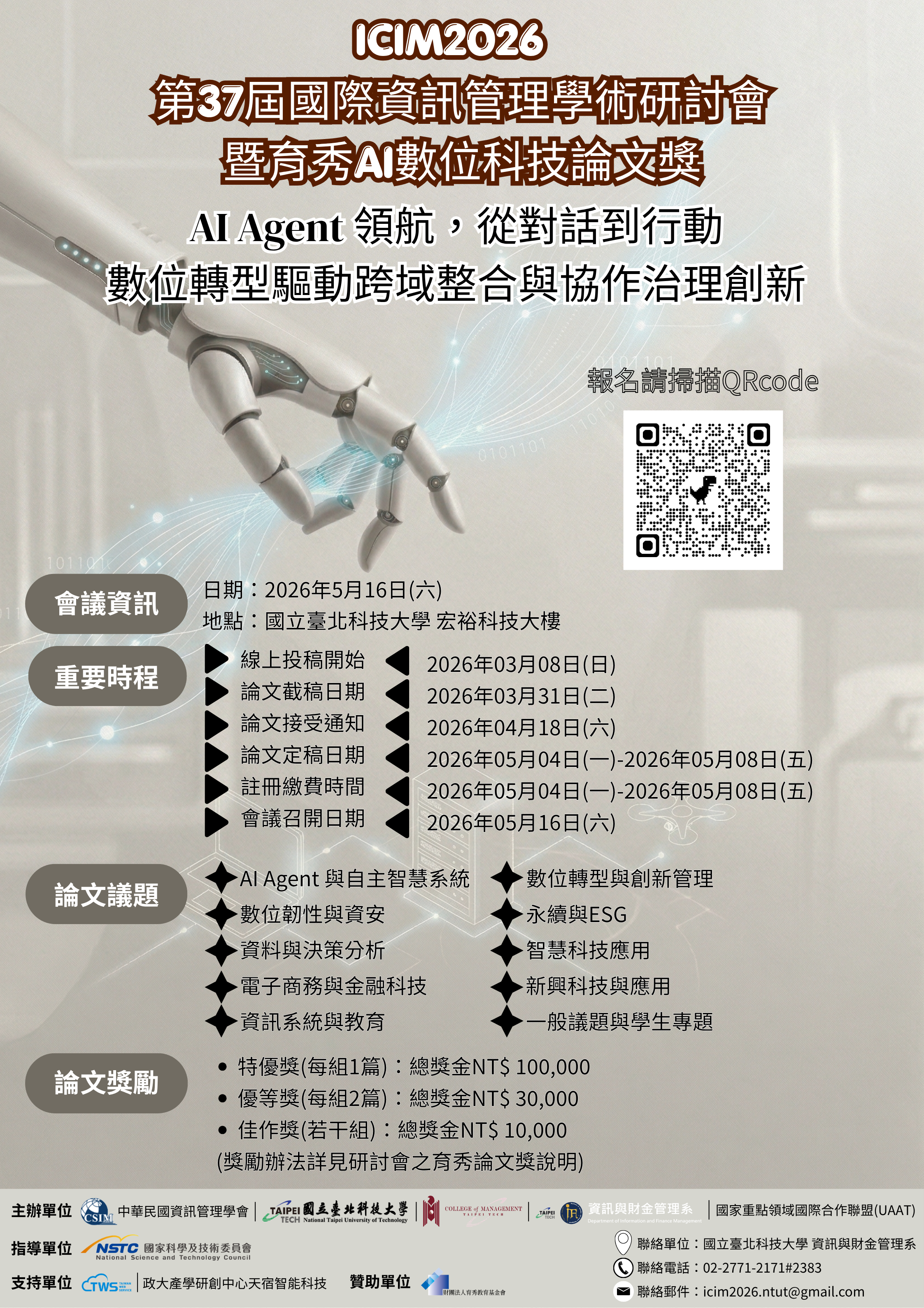 資管學會與國立臺北科技大學資訊與財金管理系共同舉辦 「ICIM 2026第37屆國際資訊管理學術研討會暨育秀AI數位科技論文獎」。