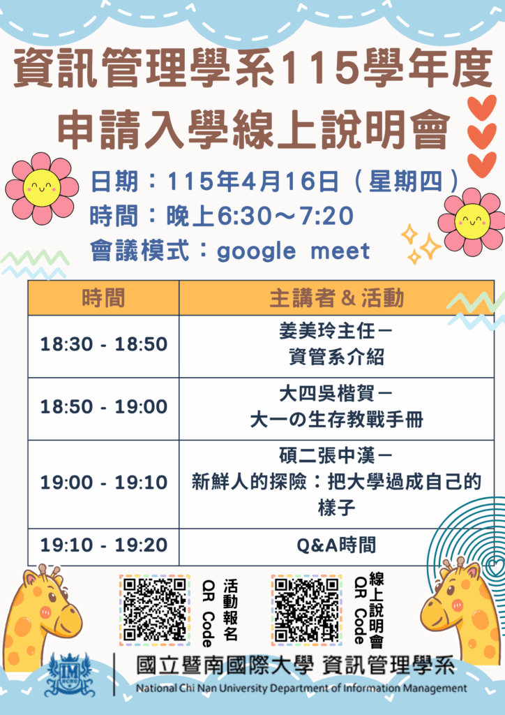 歡迎報考國立暨南國際大學資訊管理學系!本系擬於115.04.16(星期四)舉辦115學年度申請入學線上說明會,活動相關資訊如下: