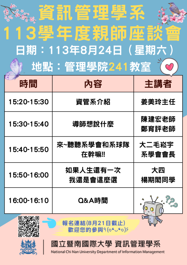 【更新因颱風來襲之碩甄複試因應措施】114學年度資管系碩士班甄試考生口試順序時間表