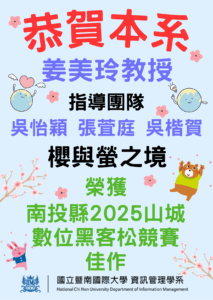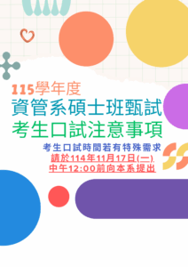 招生 115學年度資管系碩士班甄試考生口試注意事項&考生口試順序時間表 有關本系115學年度碩士班甄試口試注意事項簡述如下 Read More » 2025 年 11 月 18 日 尚無留言 招生 115學年度資管系碩士班甄試考生口試注意事項 有關本系115學年度資訊管理學系碩士班甄試考生口試 Read More » 2025 年 11 月 10 日 尚無留言 招生 【轉知】管理學院全英碩士學位學程,115 學年度入學甄試熱情招生 暨大全英學程學程課程招生|踴躍報名!大家好!培養國 Read More » 2025 年 10 月 21 日 尚無留言 招生 🙌115學年度碩士班甄試入學已開始報名囉!🙌 🙌國立暨南國際大學資訊管理學系115學年度碩士班甄 Read More » 2025 年 10 月 20 日 尚無留言 招生 115學年度特殊選才單獨招生 資訊管理學系115學年度特殊選才單獨招生已開始報名 Read More » 2025 年 10 月 18 日 尚無留言 招生 ✨資訊管理學系114學年度親師座談會✨ 本系將於114.08.24(星期日)舉辦114學年 Read More » 2025 年 8 月 15 日 尚無留言 中國信託資訊科技企業實習計畫 115學年度資管系碩士班甄試考生口試注意事項&考生口試順序時間表 「2026—22nd科技教育研究與發展學術研討會」論文徵稿 中部科學園區創新技術論壇 2026臺灣電腦輔助語言學習學會暨全球電腦輔助語言學習國際研討會 中國信託資訊科技企業實習計畫 中國信託資訊科技企業...Read More 115學年度資管系碩士班甄試考生口試注意事項&考生口試順序時間表 有關本系115學年度...Read More 「2026—22nd科技教育研究與發展學術研討會」論文徵稿 國立高雄師範大學工業...Read More 中部科學園區創新技術論壇 中部科學園區管理局舉...Read More Load More